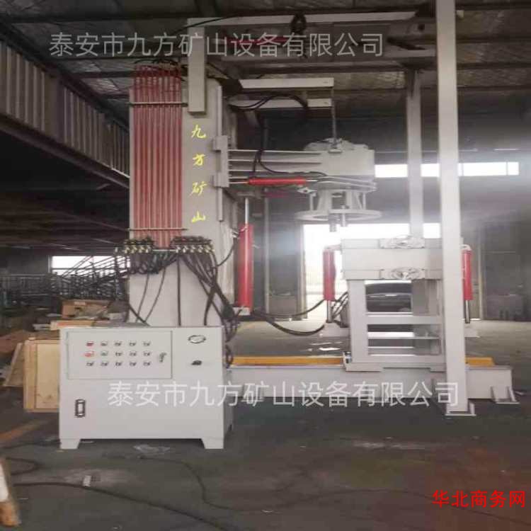 立式综采支架拆柱机是针对煤矿综采液压支架用单伸缩、双伸缩立柱、液压缸进行拆卸、装配而设计研制的一种液压维修设备。综采支架拆柱机可拆油缸径300, 400 , 500。它广泛的应用于端盖为罗纹联接的各种综采液压支架缸。该设备采用整体刚性床身、液压机构夹紧、快、慢双速滑台、棘轮摆杆配合大扭矩低速液压马达联动结构,主要有拆卸扭矩大、可灵活调节拆卸力、操作方便灵活、电液辅助控制的特点。 提高了工人的劳动强度,显著的提高了工作效率。解决了支架液压缸导向套因螺纹锈死而人工无法拆卸的难题。同时很好的避免了传统减速机传动的拆卸机因过载而损坏设备、损坏工件、造成的现象。因为扭矩的连续可调,使拆卸装配可以按计划的实行正反向旋转,实时控制转速及扭矩使系统设备更加可靠、方便。除卡键需要人工拆除外,其余各工序均可通过该设备拆装。另外该机还可以适用于卡键式立柱和螺纹式立柱的卧式装配。
